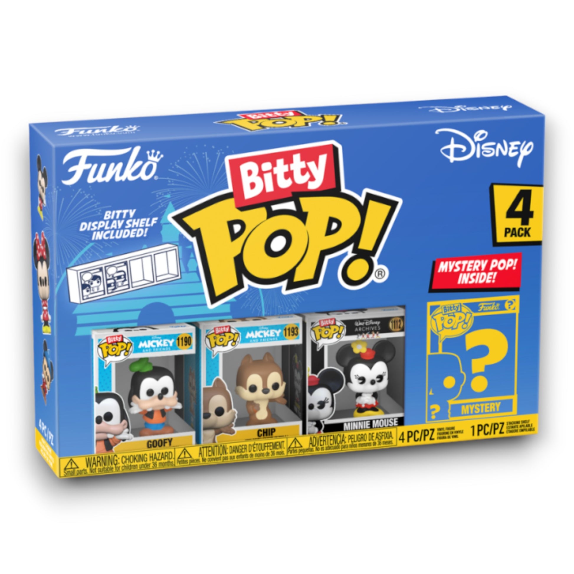 Your favorite Pops! have been shrunk into Bitty Pops! Expand your Disney collection with this assortment of Bitty Pop! figures featuring your most beloved cartoon characters! This 4-pack includes Bitty Pop! Goofy, Bitty Pop! Chip, Bitty Pop! Minnie Mouse (hands folded), and a mystery Bitty Pop! figure. The possible mystery Bitty Pops! are Hyper Rare (1/6) Steamboat Willie, Hyper Rare (1/6) Band Concert Mickey, Rare (1/3) Conductor Mickey, and Rare (1/3) Brave Little Tailor. Bitty Pops! are packaged in hard acrylic cases with detachable bottom lids. Detachable bottom lids double as acrylic bases, to which the Bitty Pop! figures are adhered. Sort and arrange your Bitty Pops! with the included display case! Acrylic display cases are stackable and hold four Bitty Pop! figures each. Vinyl figures are approximately 0.9-inches tall. Four figures per single package purchase. Warning: Choking Hazard. Collectibles are small. Not for children under the age of 3 years old. Item selection is random, as each piece is in blind packaging. We cannot accept requests for specific items. You may receive duplicate figures.