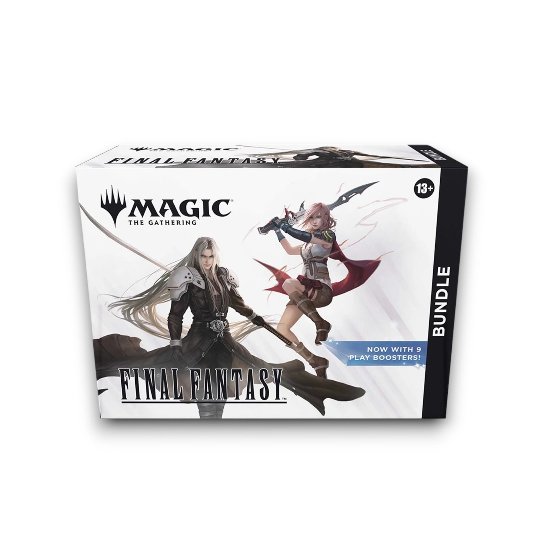 Enter battle in Magic: The Gathering with some of the most iconic characters, items, and moments from the sixteen core games in the legendary FINAL FANTASY series. Step into these unforgettable stories and give them a whole new spin! This Bundle includes a full inventory of treasures, with 9 Magic: The Gathering—FINAL FANTASY Play Boosters (each containing 14 cards), 2 Traditional Foil Extended-Art cards, 16 Traditional Foil and 16 nonfoil Full-Art Basic Land cards, 1 oversized Spindown life counter, 1 FINAL FANTASY card storage box, and 2 reference cards. This product does not contain a serialized card (available in English-language Collector Boosters only).