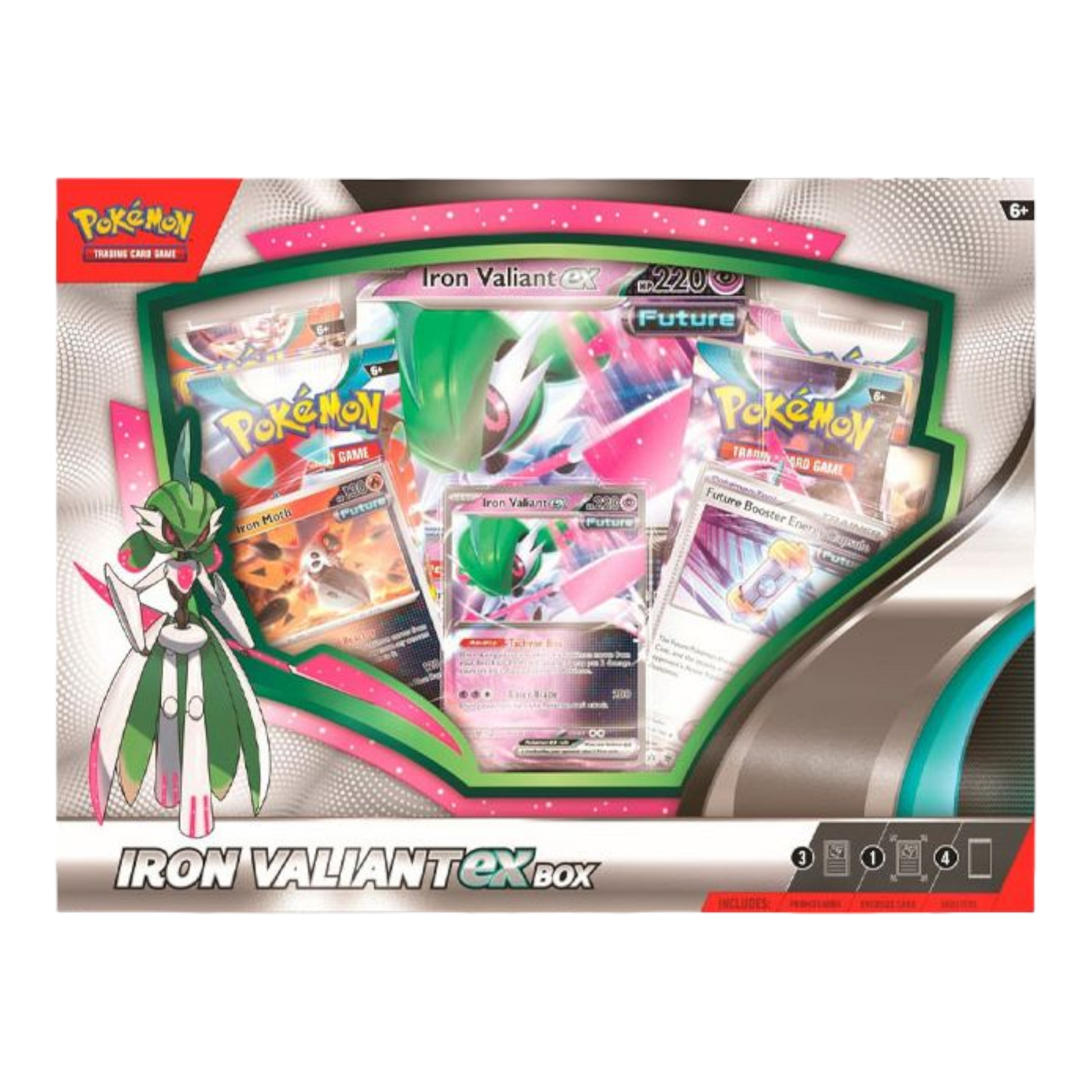 In this box, you get a promo card and an oversize card featuring either Roaring Moon ex or Iron Valiant ex. Roaring Moon ex is joined by Brute Bonnet and an Ancient Booster Energy Capsule, and Iron Valiant ex comes with Iron Moth and a Future Booster Energy Capsule—all things that your past self would want you to have to help you out in the future. Find even more helpful allies in the included Pokémon TCG booster packs!