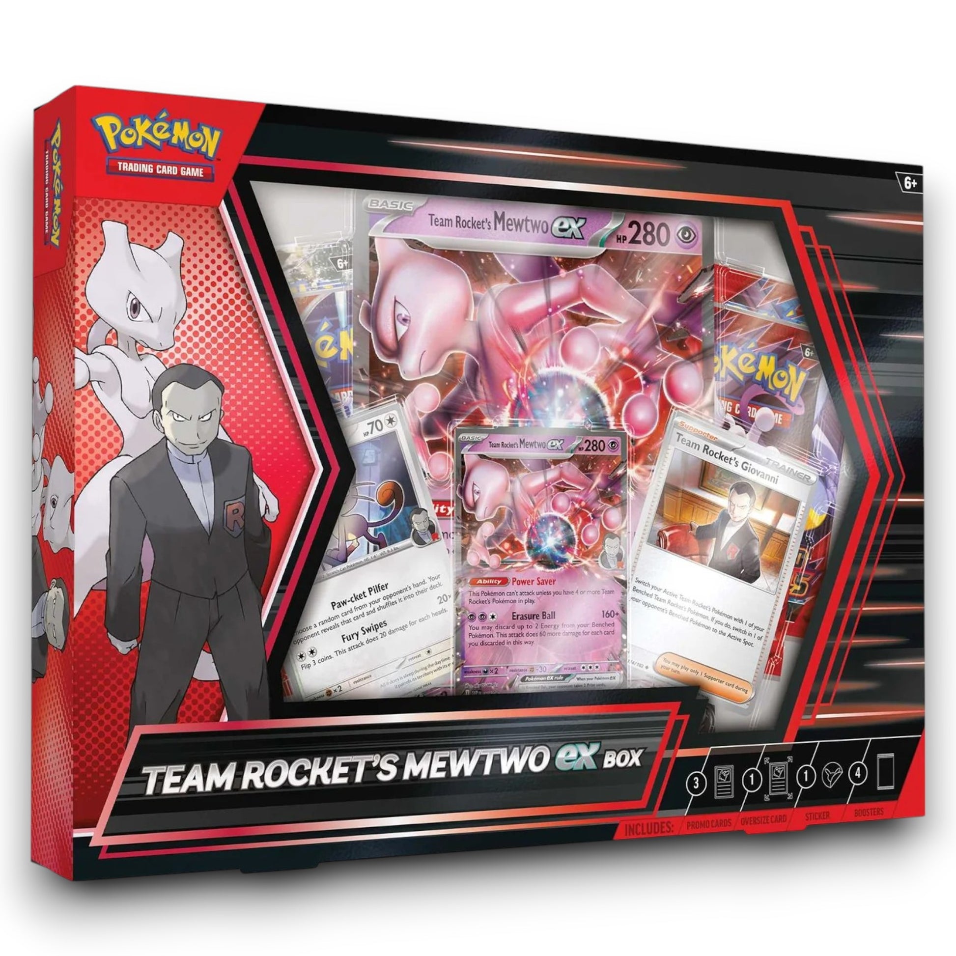 The Pokemon TCG: Team Rocket's Mewtwo ex Box includes: