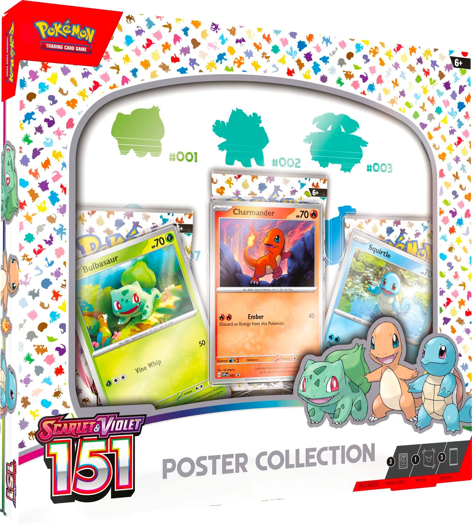 An epic journey through the Kanto region wouldn’t be complete without a first partner Pokémon! Add Bulbasaur, Charmander, and Squirtle to your team as playable foil promo cards, then work on completing your Kanto Pokédex by opening more booster packs from the special Scarlet & Violet—151 expansion. On top of it all, you’ll find a colorful poster that’s ready to hang wherever you like!